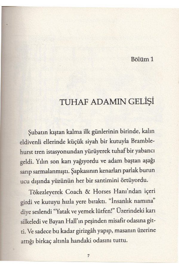 9 - 13 Yaş için Uygundur Dikişli Cilt Kalın Sıvama Karton Kapak Bir kar fırtınası sırasında tuhaf bir adam Iping adında bir İngiliz köyüne gelir. Köylüler Coach& Horses hanına yerleşen bu adamla nasıl iletişim kuracaklarını bilemezler. Yüzü sargılarla kaplıdır. Ellerinde eldiven, başında ise bir şapka vardır ve tüm zamanını odasında geçirir. Köylüler adamın görünmez olduğunu anladıklarında köyde suçlar işlenmeye başlanmıştır bile. Bir süre sonra herkes onun peşine düşer