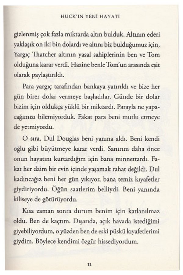 9 - 13 Yaş için Uygundur Dikişli Cilt Kalın Karton Kapak Tom Sawyer´ın en iyi arkadaşı Huckleberry Finn´le tanışın. Huck´ın tek istediği maceradır ama yaşadığı yerdeki iyi niyetli insanlar onu hep medenileştirmeye çalışır. Huck sonunda kaçak bir köle olan Jim´le birlikte Mississippi Nehri´nde bir maceraya atılır. Yol boyunca karşılarına pek çok tuhaf kişi çıkar. Mark Twain, zengin karakterleriyle 19. yüzyılın Amerikan yaşantısını resmederken aynı zamanda ırkçılığı eleştiriyor.