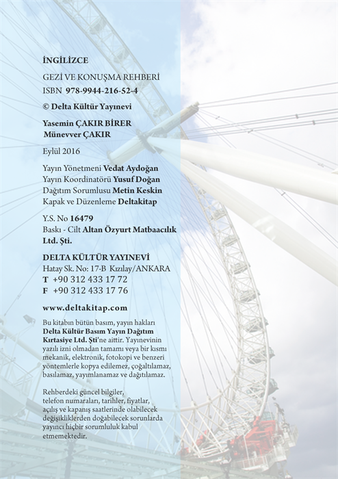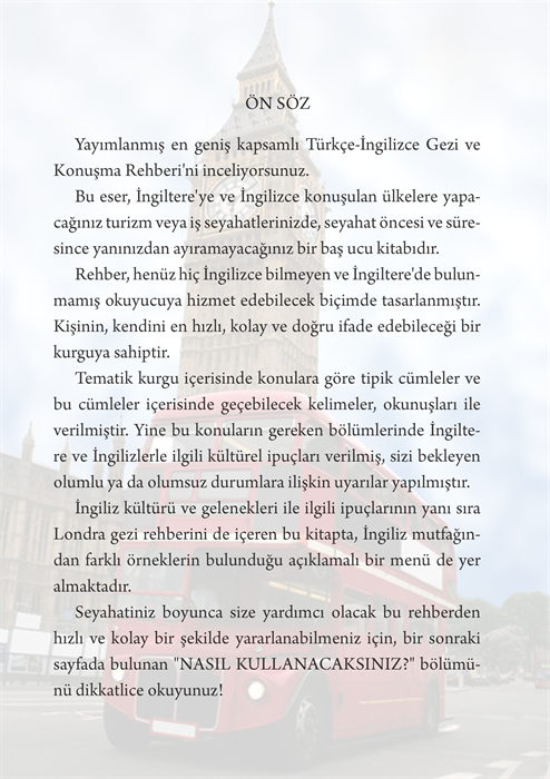 Yayımlanmış en geniş kapsamlı Türkçe-İngilizce Gezi ve Konuşma Rehberi’ni inceliyorsunuz. Bu eser, İngiltere'ye ve İngilizce konuşulan ülkelere yapacağınız turizm veya iş seyahatlerinizde, seyahat öncesi ve süresince yanınızdan ayıramayacağınız bir başucu kitabıdır. Rehber, henüz hiç İngilizce bilmeyen ve İngiltere'de bulunmamış okuyucuya hizmet edebilecek biçimde tasarlanmıştır. Kişinin, kendini en hızlı, kolay ve doğru ifade edebileceği bir kurguya sahiptir. Tematik kurgu içerisinde konulara göre tipik cümleler ve bu cümleler içerisinde geçebilecek kelimeler, okunuşları ile birlikte verilmiştir. Yine bu konuların gereken bölümlerinde İngiltere ve İngilizlerle ilgili kültürel ipuçları verilmiş, sizi bekleyen olumlu ya da olumsuz durumlara ilişkin uyarılar yapılmıştır. İngiliz kültürü, gelenekleri ile ilgili ipuçları ve Londra gezi rehberini de içeren bu rehberde, İngiliz mutfağının farklı örneklerinin bulunduğu açıklamalı bir menü de yer almaktadır. Seyahatiniz boyunca size yardımcı olacak bu rehberden hızlı ve kolay yararlanabilmeniz için "NASIL KULLANACAKSINIZ?" bölümünü dikkatlice okuyunuz!