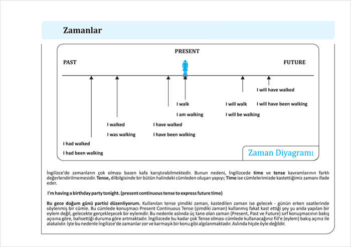 İngilizce öğrenenler için her zaman karmaşık ve zor olarak değerlendirilen ZAMAN "TENSE" kavramı tek başına ele alınmıştır. Cep boyutunda hazırlanmış olan kitabın her sayfası ikiye katlanmış olup açıldığında o TENSE’i tek başına bir tabloda bütün detaylarıyla ve örneklemeleriyle incelemektedir. Yine her TENSE’in sonunda verilen EXERCISES bölümü ile anlatılanlar pekiştirilmiştir.