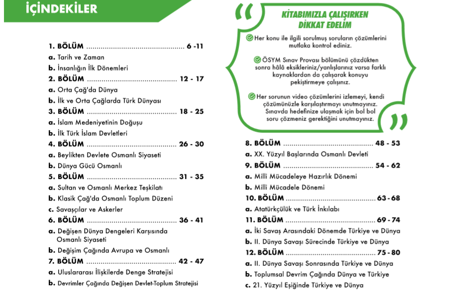 Tarih konuları uzun ve sıkıcıdır. Bu kitap, işinize yarayacak özet bilgileri tablolarla ve haritalarla anlatıyor. 5 net yapmanızı garanti eden; kolay anlaşılır, kendi kendine çözülebilen, video çözümlerin izlenebildiği eşsiz bir kaynak.