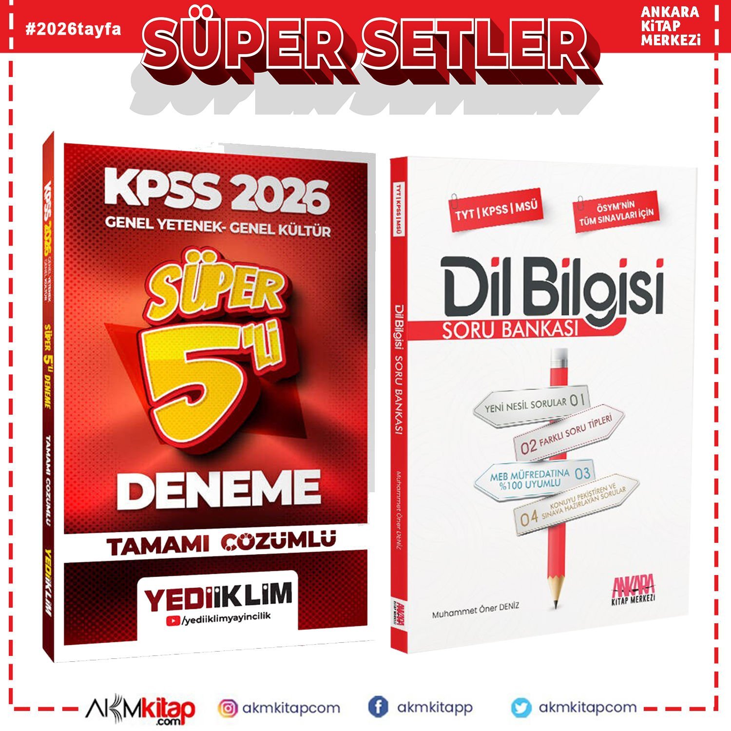 Yediiklim Yayınları 2026 KPSS Genel Yetenek Genel Kültür Tamamı Çözümlü Süper 5 li Deneme ve AKM Dil Bilgisi Soru Bankası Seti 2 Kitap